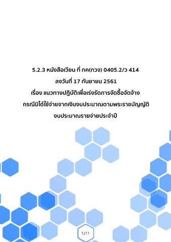5.2.3 หนังสือเวียน ที่ กค(กวจ) 0405.2/ว 414 ลงวันที่ 17 กันยายน 2561 เรื่อง แนวทางปฏิบัติเพื่อเร่งรัดการจัดซื้อจัดจ้าง กรณีมิได้ใช้จ่ายจากเงินงบประมาณตามพระราชบัญญัติ งบประมาณรายจ่ายประจ�าปี 1211