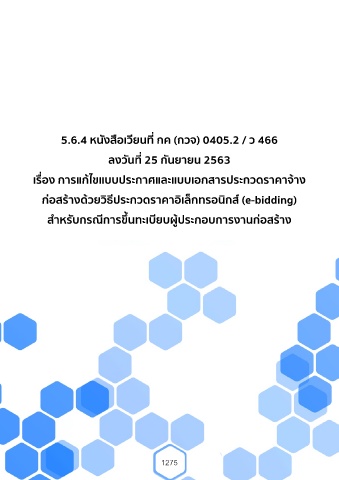 5.6.4 หนังสือเวียนที่ กค (กวจ) 0405.2 / ว 466 ลงวันที่ 25 กันยายน 2563 เรื่อง การแก้ไขแบบประกาศและแบบเอกสารประกวดราคาจ้าง ก่อสร้างด้วยวิธีประกวดราคาอิเล็กทรอนิกส์ (e-bidding) ส�าหรับกรณีการขึ้นทะเบียบผู้ประกอบการงานก่อสร้าง 1275
