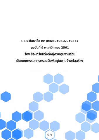 5.6.5 ข้อหารือ กค (กวจ) 0405.2/049571 ลงวันที่ 9 พฤศจิกายน 2561 เรื่อง ข้อหารือแต่งตั้งผู้ควบคุมงานร่วม เป็นคณะกรรมการตรวจรับพัสดุในงานจ้างก่อสร้าง 1278