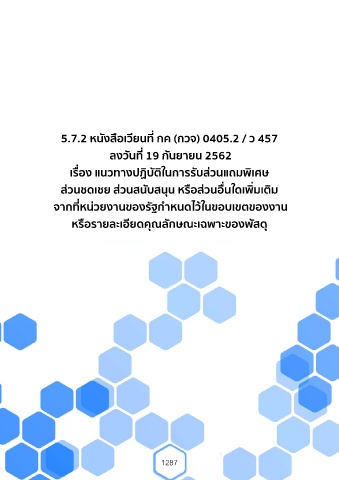 5.7.2 หนังสือเวียนที่ กค (กวจ) 0405.2 / ว 457 ลงวันที่ 19 กันยายน 2562 เรื่อง แนวทางปฏิบัติในการรับส่วนแถมพิเศษ ส่วนชดเชย ส่วนสนับสนุน หรือส่วนอื่นใดเพิ่มเติม จากที่หน่วยงานของรัฐก�าหนดไว้ในขอบเขตของงาน หรือรายละเอียดคุณลักษณะเฉพาะของพัสดุ 1287