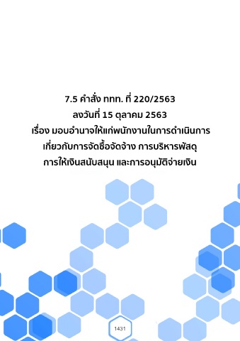 7.5 ค�าสั่ง ททท. ที่ 220/2563 ลงวันที่ 15 ตุลาคม 2563 เรื่อง มอบอ�านาจให้แก่พนักงานในการด�าเนินการ เกี่ยวกับการจัดซื้อจัดจ้าง การบริหารพัสดุ การให้เงินสนับสนุน และการอนุมัติจ่ายเงิน 1431