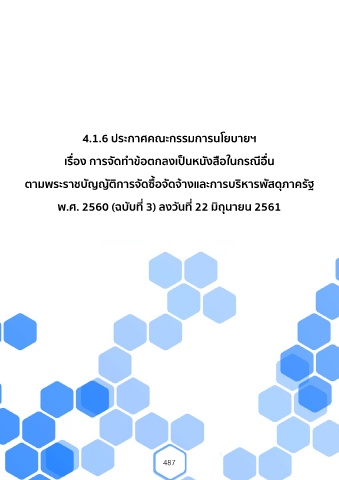 4.1.6 ประกาศคณะกรรมการนโยบายฯ เรื่อง การจัดท�าข้อตกลงเป็นหนังสือในกรณีอื่น ตามพระราชบัญญัติการจัดซื้อจัดจ้างและการบริหารพัสดุภาครัฐ พ.ศ. 2560 (ฉบับที่ 3) ลงวันที่ 22 มิถุนายน 2561 487