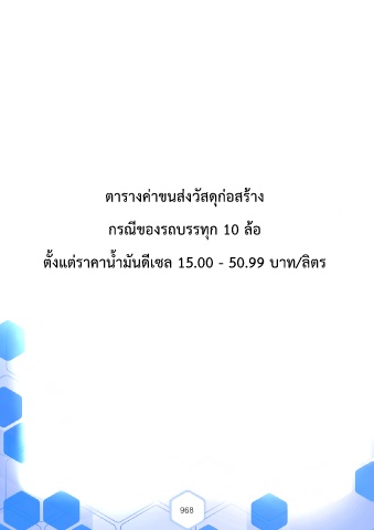 ตารางค่าขนส่งวัสดุก่อสร้าง กรณีของรถบรรทุก 10 ล้อ ตั้งแต่ราคาน้้ามันดีเซล 15.00 - 50.99 บาท/ลิตร 968